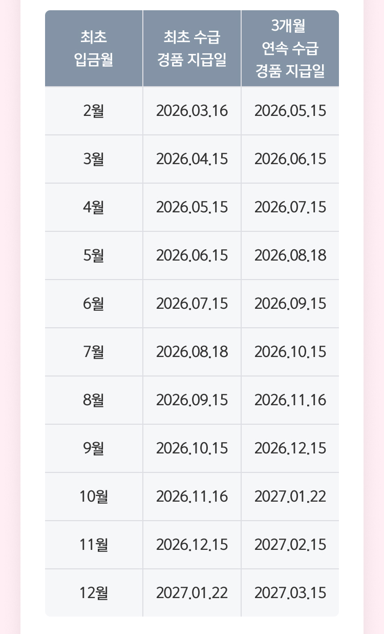 | 최초 입금월 | 최초 수급 경품 지급일 | 3개월 연속 수급 경품 지급일 |