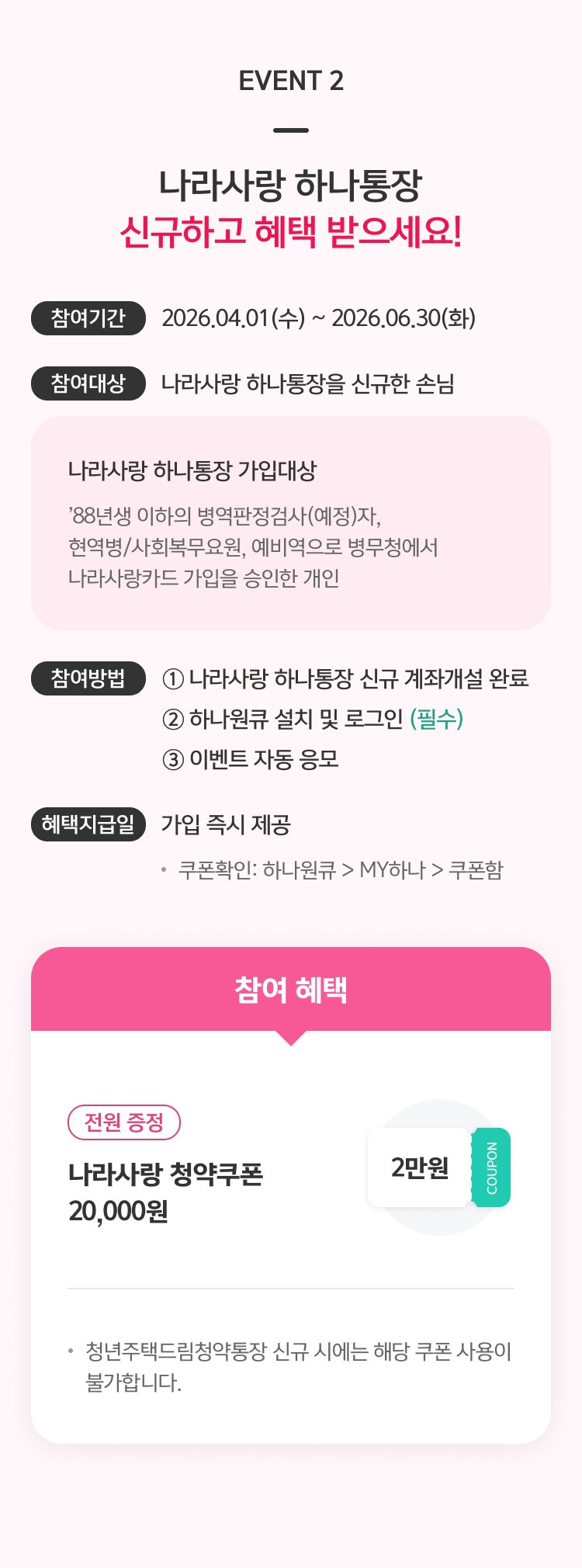 - 쿠폰은 하나 나라사랑카드 정상 보유 회원에 한해서만 지급이 가능하며, 지급 시점에 카드해지, 탈회회원 등은 지급되지 않습니다.