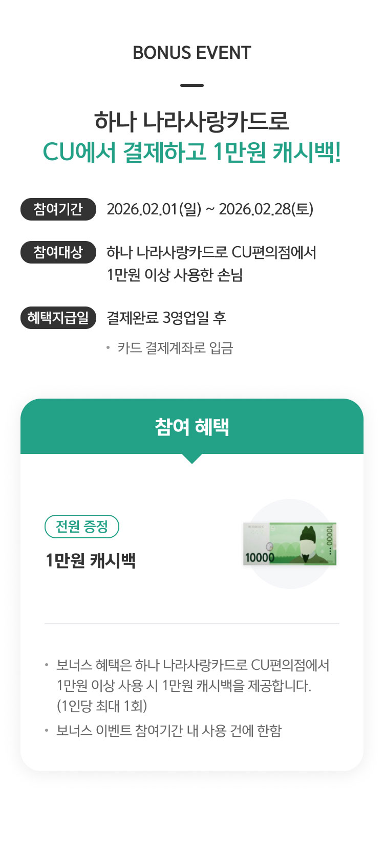 - 이벤트 대상: 보너스 이벤트 기간 내 하나 나라사랑카드로 CU편의점에서 결제한 손님