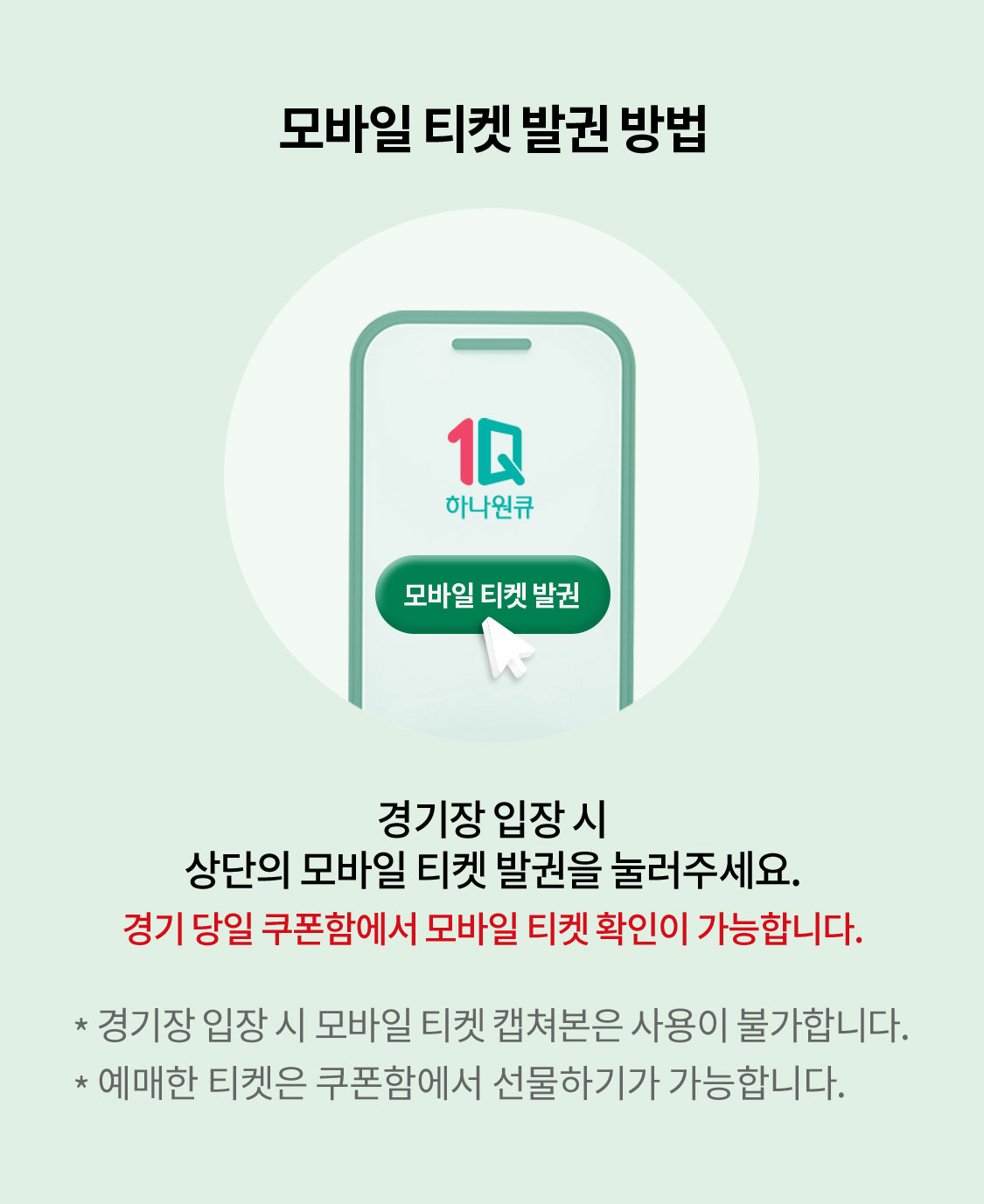* 경기장 입장 시 모바일 티켓 캡처본은 사용이 불가합니다. * 예매한 티켓은 쿠폰함에서 선물하기가 가능합니다.